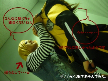 おぐらさんお誘いありがとう!(ノ-<。 写真を撮りたいが為に行ったのですが、一般より着たほうがいくぶんか安いので一応着ました。 おぐらさんとDB人造人間17・18を交換してみました(笑 おぐらさんは完璧にカッコヨスなメンズになったのですが。 私のほうは、壮絶なオカマっぷりw 行くことになったのを当日までみりたんに内緒にしてたのですが、 更衣室並びの列で着替えを終えたみりたん・みしかさん・かるてさんに遭遇。 そこまでは見つからないように注意してたんですが、油断がでました← でも若干のドッキリ成功です-∀-ムフフ デ//ヵとや●まを撮らしていただいてきやした☆ ただね、やっぱり情文だとうちのカメラちゃんは死・亡。 役に立たん!!!!! しねばいいよね自分。的なアレです。 それでも何枚かは見れる範囲のものが撮れたので良かったですが。。。 デ//ヵに関しては、ガチ百合設定などを説明していただいて、ひとしきり大興奮しました(笑 ガチをふまえた上で撮りたい写真があったのですが、やってもらうの忘れたよね・・・ 今度説明してやってもらいます!← 公開できそうな写真があんまりないのでとりあえず・・・ *デ//ヵレン *や●ま 勝手に加工とか施してすみません>みりたん・みしかさん・かるてさん *マクロスF ・シェリル・ノーム@馨さん 長身・小顔・足長の美女を発見!!!!!! 射手座☆好きなのでおぐらさんと2人でぎゃぁぎゃぁ騒いでましたw 色々お話おつきあいありがとうございました*^∀^* 別衣装も是非! *DB ・17号@おぐらねぇさん 2枚目のポーズがとても気に入ってますv 強そうでしょ!!イイヨネ!!! ちなみに、この日のわたくし↓ ドSw 素で嬉しそうなのは消していじめっ子だからではありません! デ//ヵを愛しているからですよ!愛です! 是非5人、いや6人(+ブレイク)、いや8人!(+ドギー・スワン)揃ってデ//ヵあわせやってください!